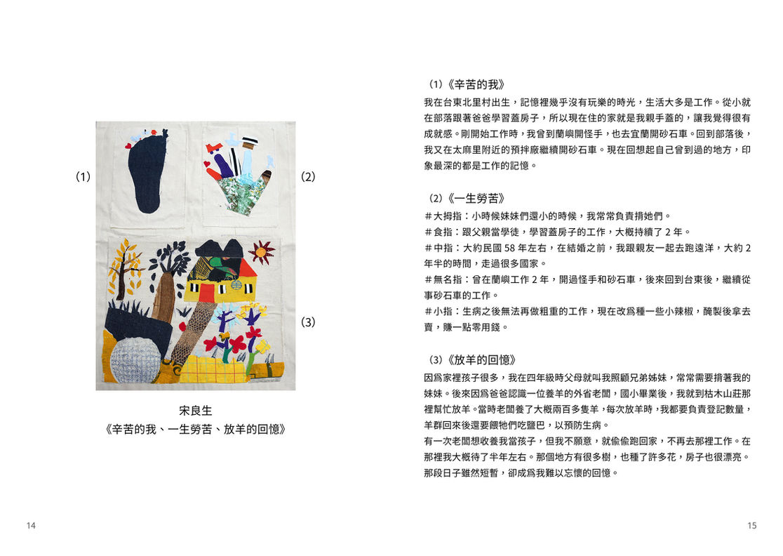 北里文化健康站 的長者們呈現共同創作的拼布作品,是將部落節期的美食文化巧妙貼於布面之上。每一位長者在創作過程中,親手剪裁、拼貼展現自身手藝,也將過去的生活片段和文化元素重新編織。作品內容蘊含著長者的智慧,透過討論和分享訴說著父母親曾經告訴他們的過往經驗,如當台灣欒樹開花時就可以播種小米和樹豆(雖然有些植物可以在當中的三個月內種植,但還是有最好的月份),1月~12月份所種植或收成的食物,對部落長者來說都是重要的食物,長者們利用每一塊布料,所呈現的不單單是故事,而是長者的智慧與文化的記錄。